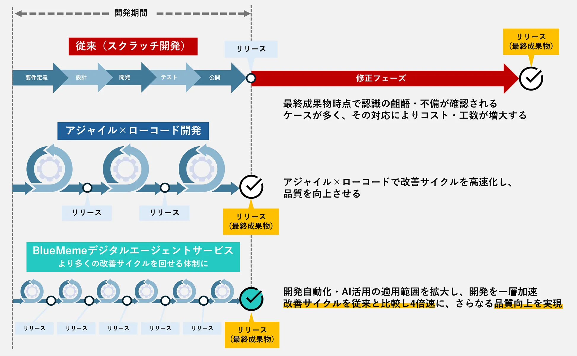 少人数で迅速に。将来的には従来のスクラッチ開発の最大4倍速のサイクルを目指す