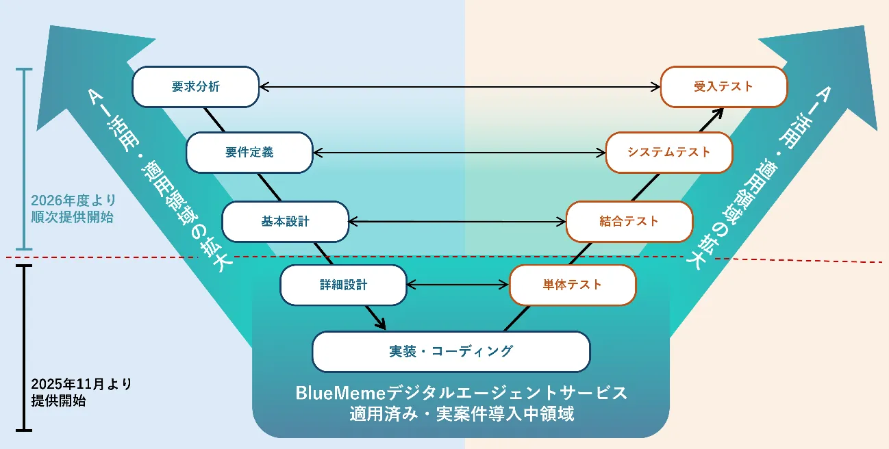 2026年度には上流工程にも対応できるAIを搭載した機能を追加予定。上流工程から開発・テストまでをデジタルエージェントがサポートし、将来的には従来の開発手法と比較して最大4倍速の改善サイクルを目指します。