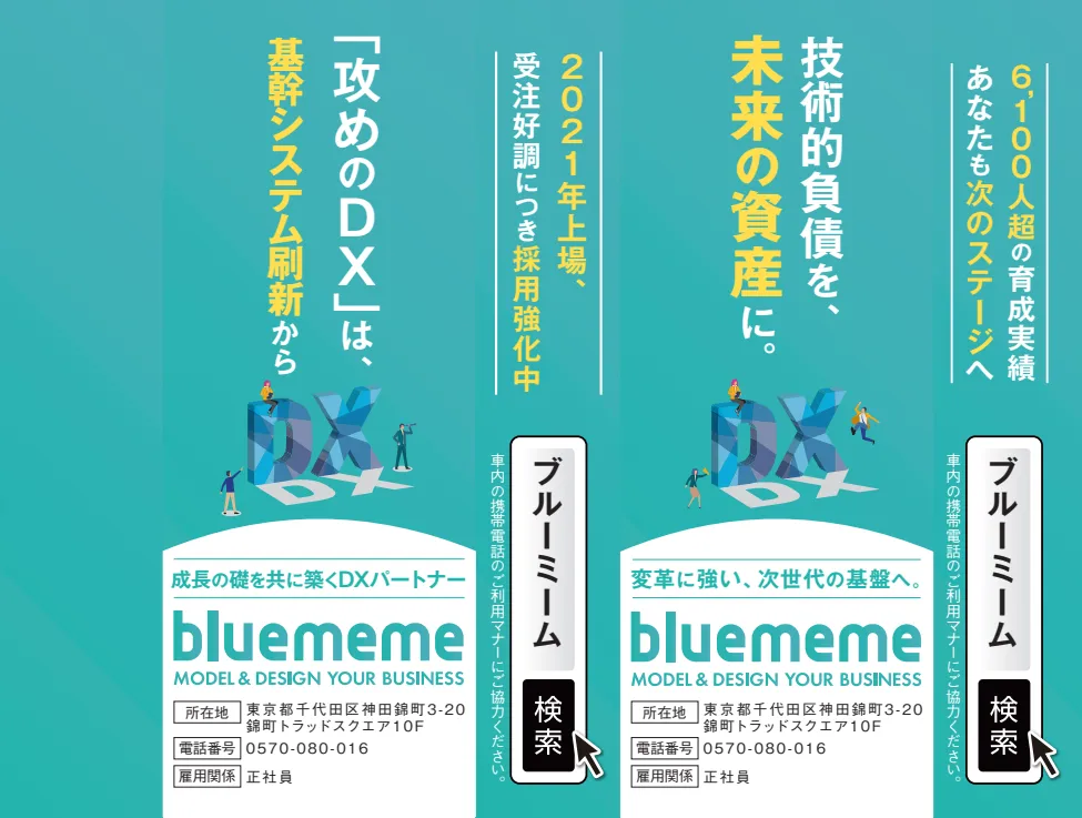 株式会社BlueMeme(本社:東京都千代田区、代表取締役社長:宮脇 訓晴、以下 当社)は、2025年10月9日(木)より、都営地下鉄 浅草線・三田線・新宿線・大江戸線の吊手広告の掲出を開始しました。